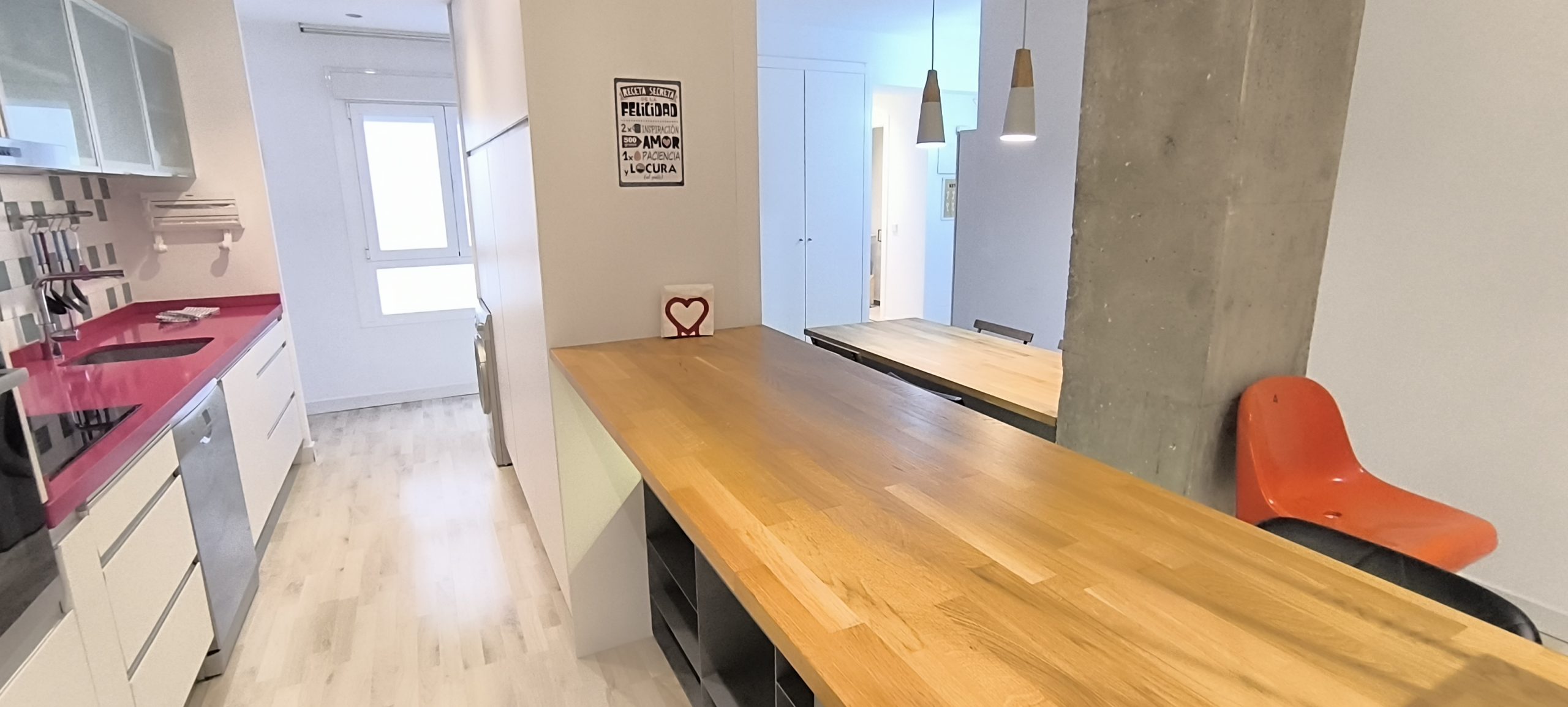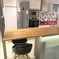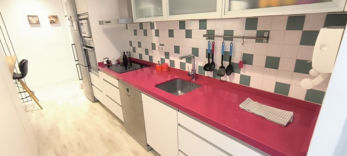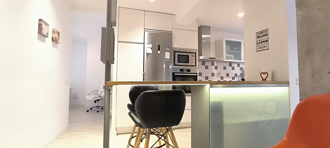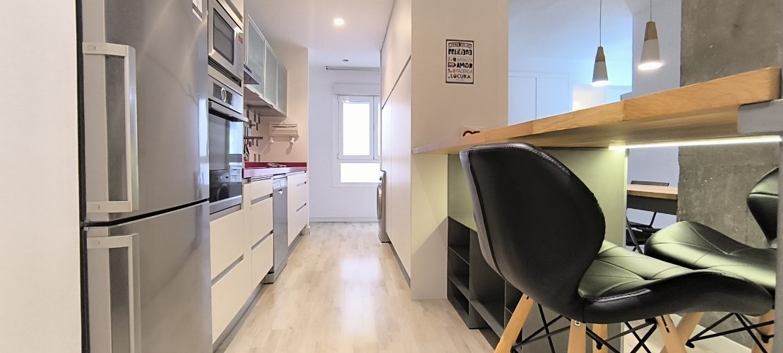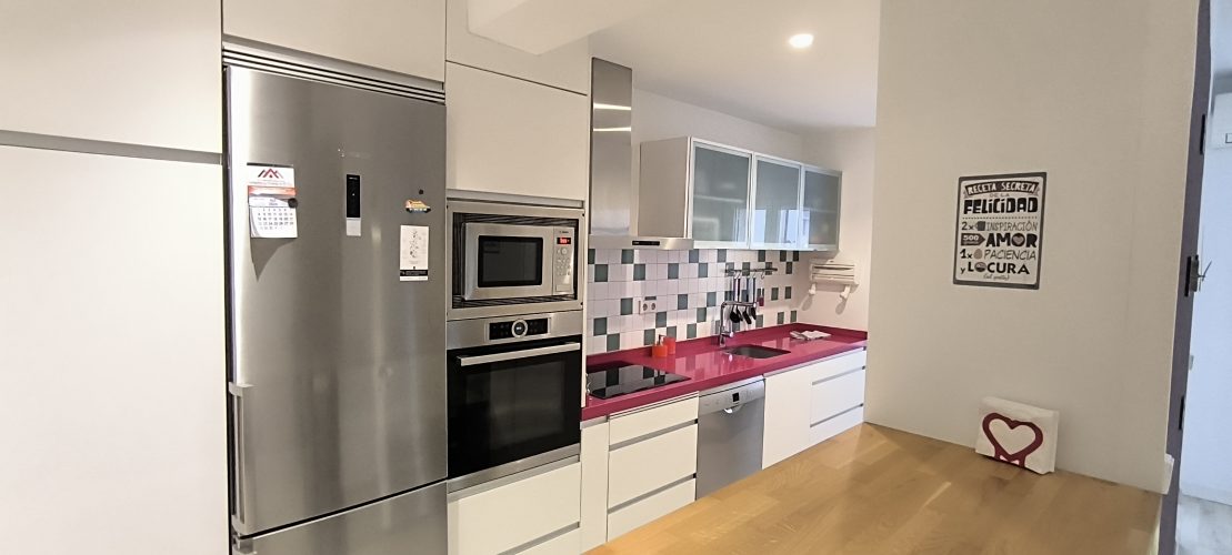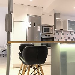 – COCINA: Un espacio abierto, con barra de madera, para compartir mientras se cocina, para teletrabajar o simplemente para comer. Cuenta con otro espacio adicional con las mismas funciones, también con superficie de madera. Además, dispone de todos los electrodomésticos como LAVADORA, LAVAVAJILLAS,