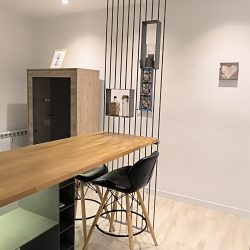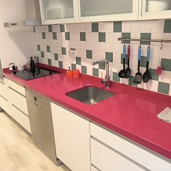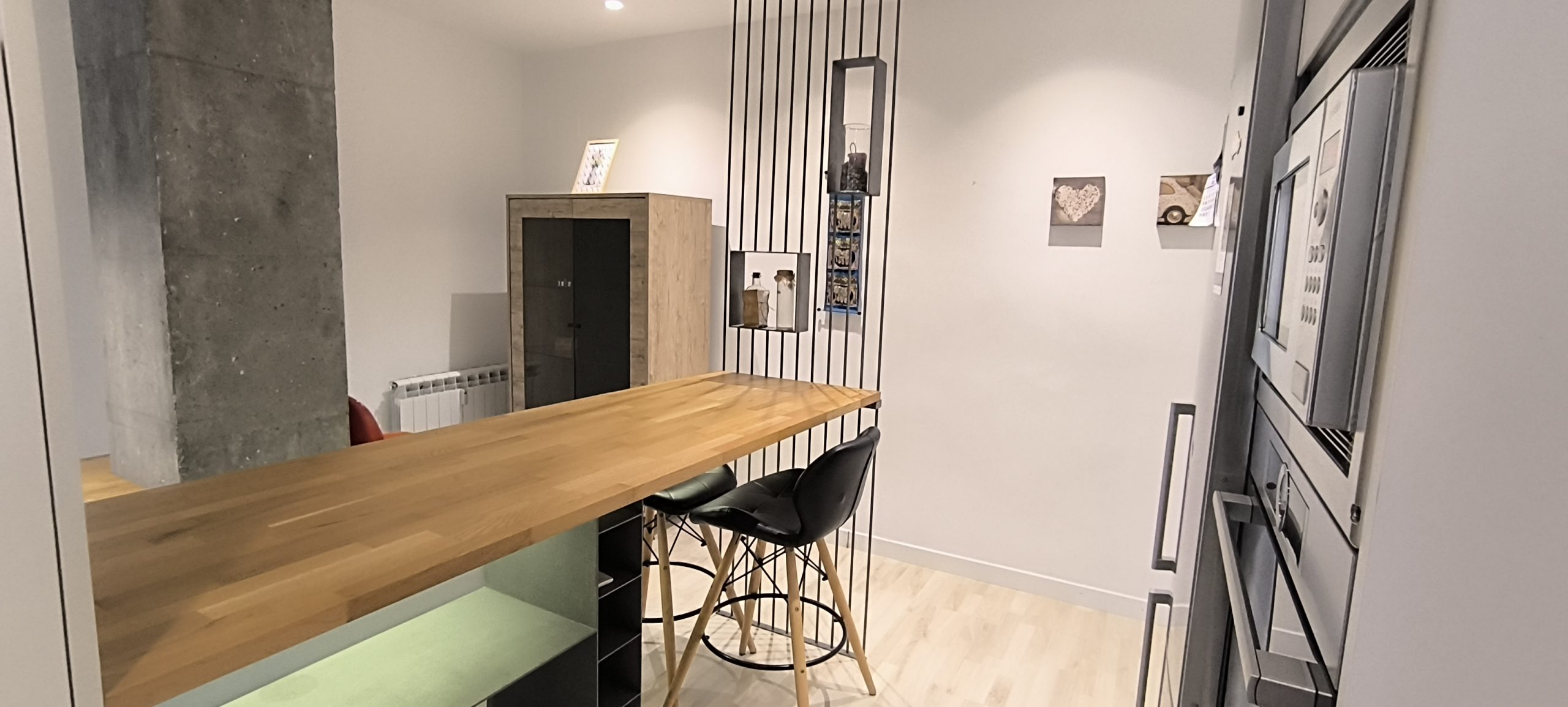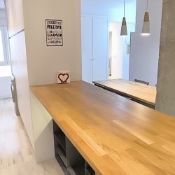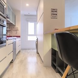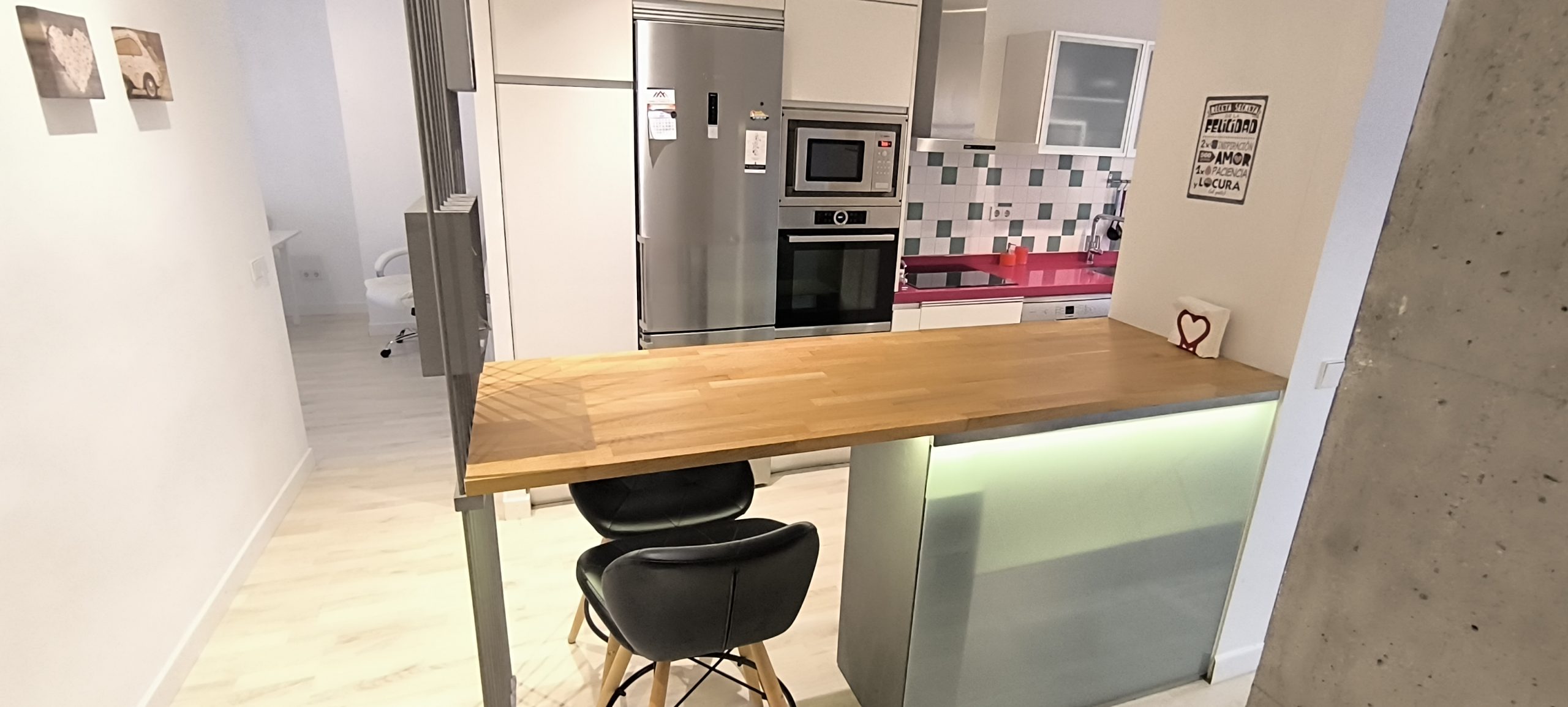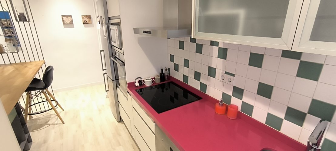 – COCINA: Un espacio abierto, con barra de madera, para compartir mientras se cocina, para teletrabajar o simplemente para comer. Cuenta con otro espacio adicional con las mismas funciones, también con superficie de madera. Además, dispone de todos los electrodomésticos como LAVADORA, LAVAVAJILLAS,